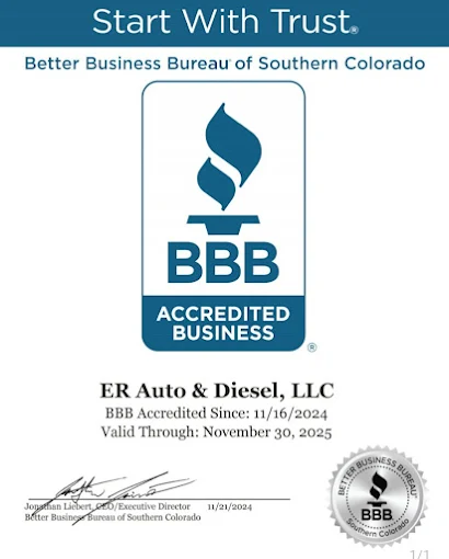 ER Auto & Diesel, LLC is accredited by the Better Business Bureau (BBB) of Southern Colorado, making us a trusted auto repair shop in Trinidad, CO. Our wide range of truck repair services meet the highest standards of industry compliance and quality, so you always leave our shop with peace of mind.